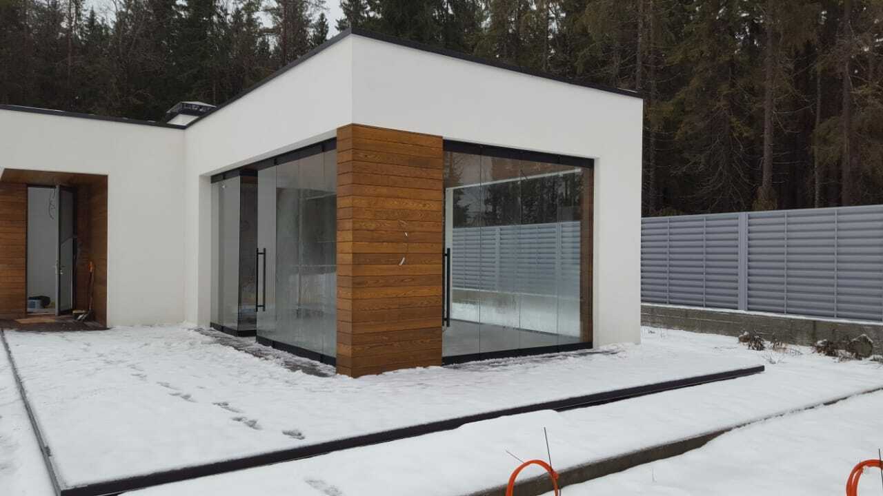 По желанию заказчика мы выполнили безрамное остекление террасы. В данном проекте использовали трансформируемые перегородки, чтобы в теплое время года была возможность сдвинуть стекло в сторону и освободить дополнительное пространство на участке в соответствии с пожеланием клиента.